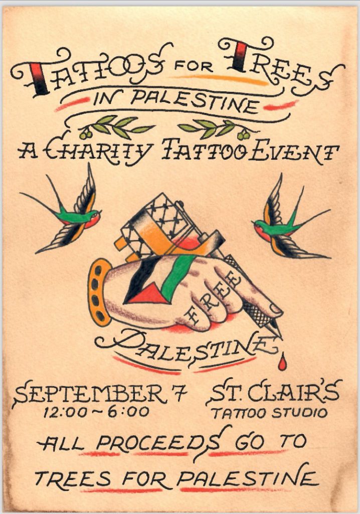Dinky Dyke Tattoos has organised a flash day and all proceeds will go to medical aid for Palestine – @medicalaidpal – and World Central Kitchen, a non-profit organisation that prepares and serves fresh, nourishing meals to communities impacted by natural disasters and during humanitarian crises.
