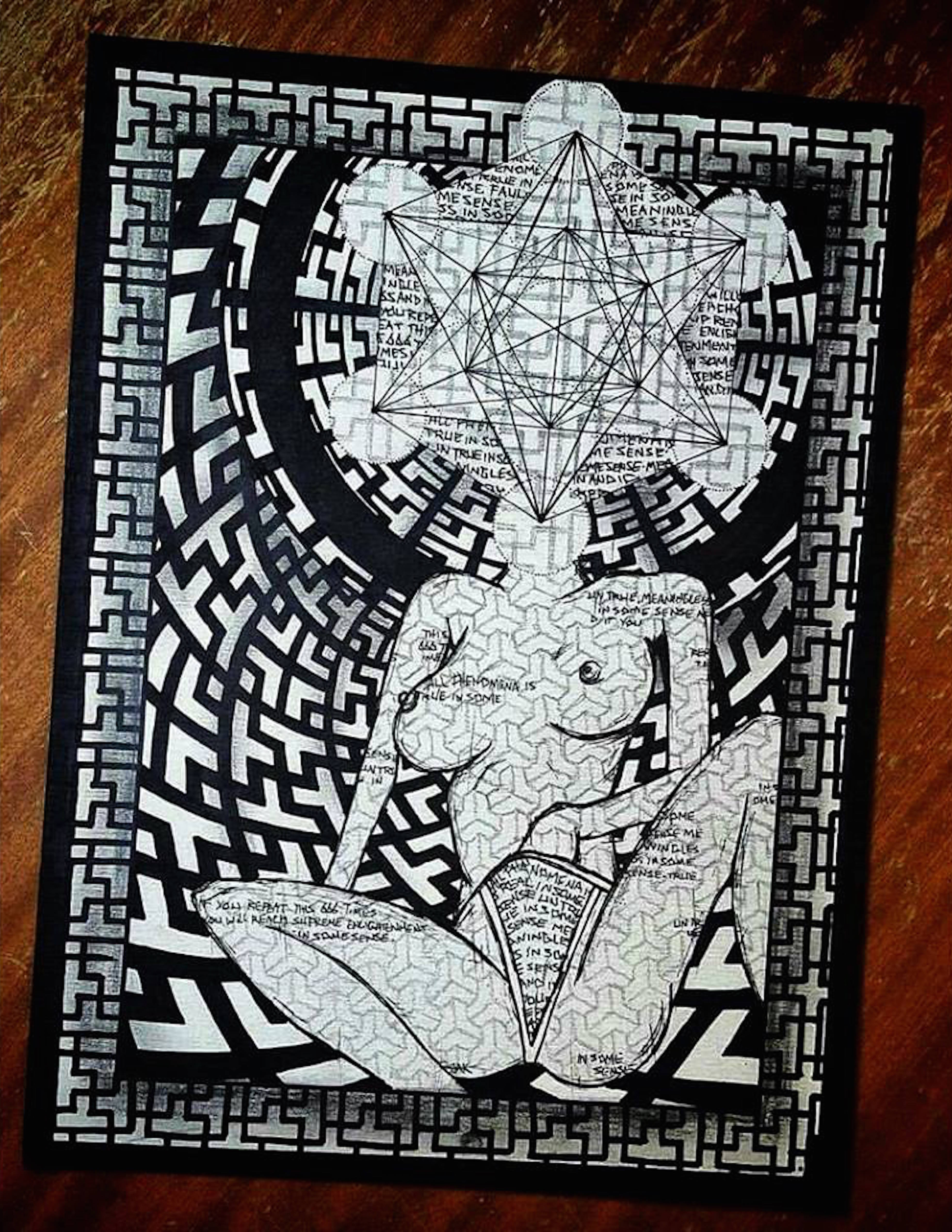 I’ve drawn since I was very young, along with playing music. I’m self-taught in almost everything I do. My art has transformed immensely over the years due to life experiences and psychedelics. Generally, it’s a combination of geometry and sacred symbols, or sex… as I have a passionate love/hate for it. I’m aware of the immense positive and negative aspects to it.